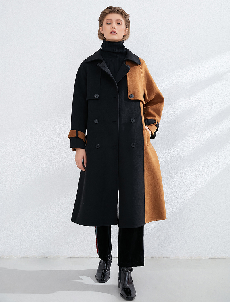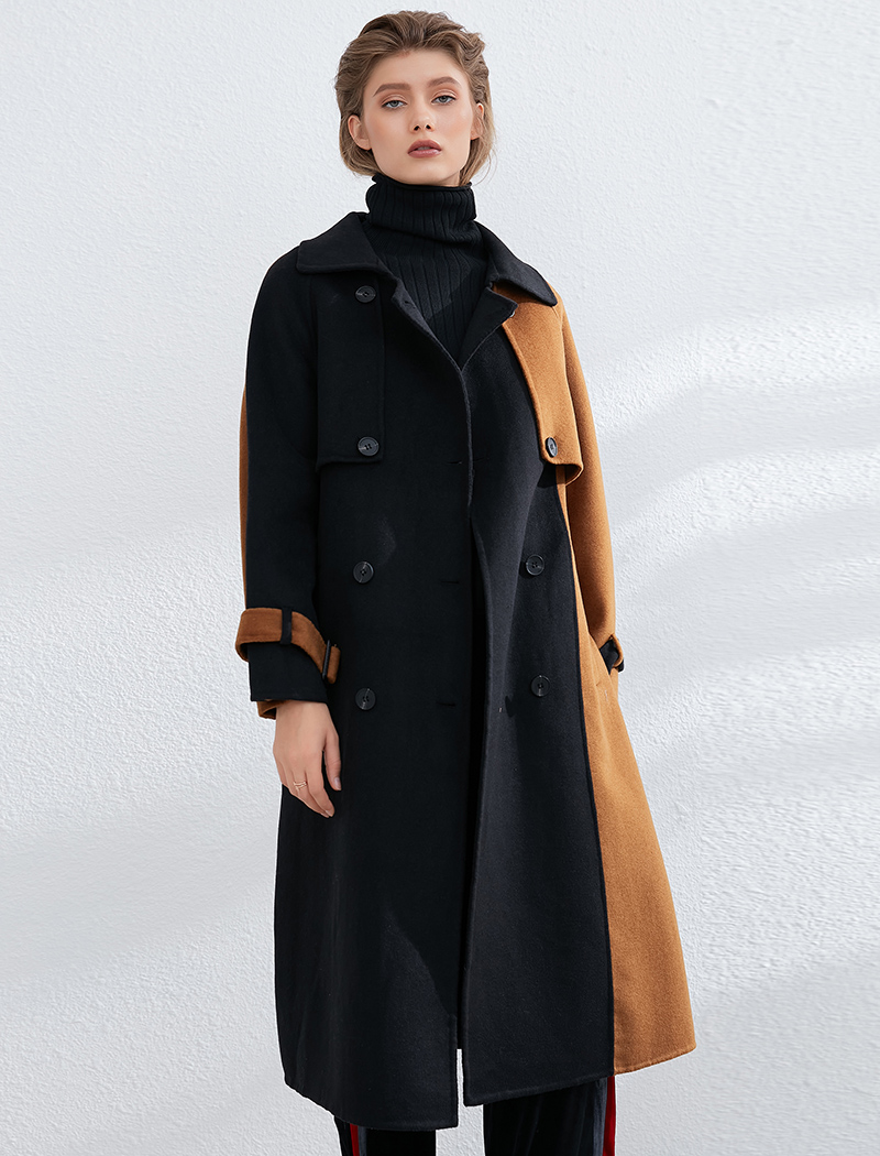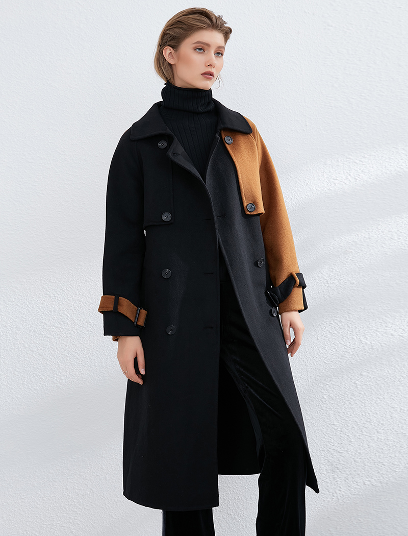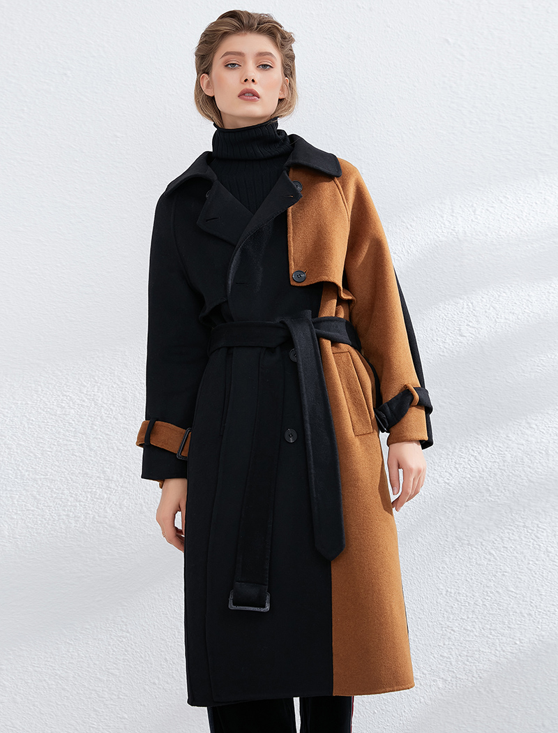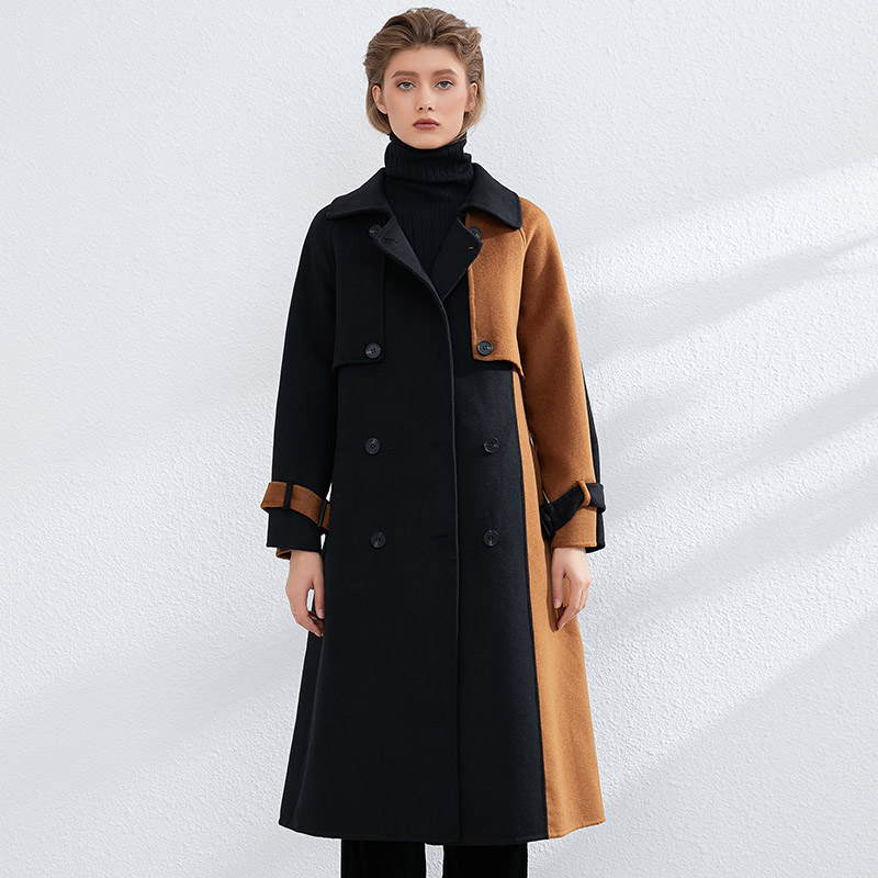 Aachoae Women Patchwork 100% Wool Long Coat With Belt 2020 Vintage Long Sleeve Pockets Jacket Winter Double Breasted Outerwear