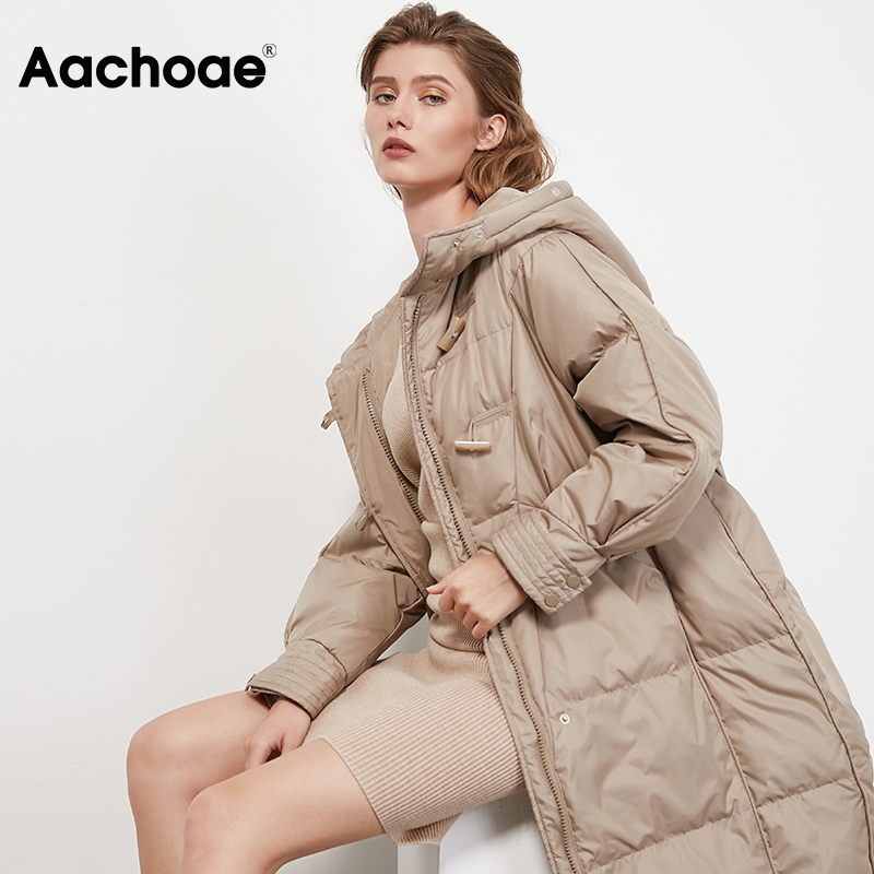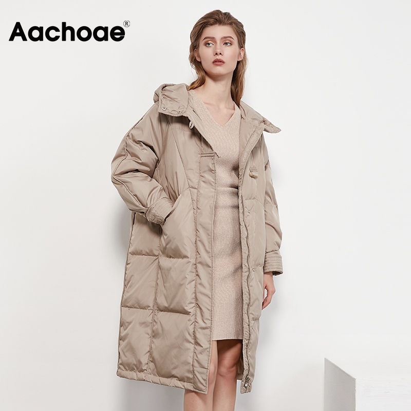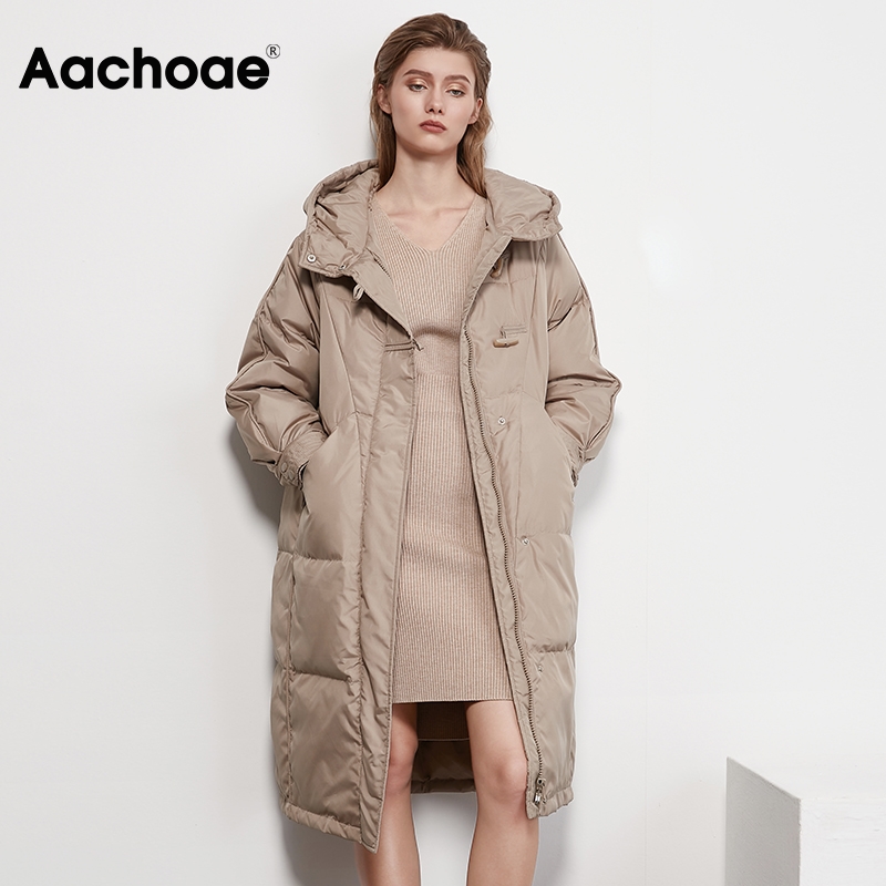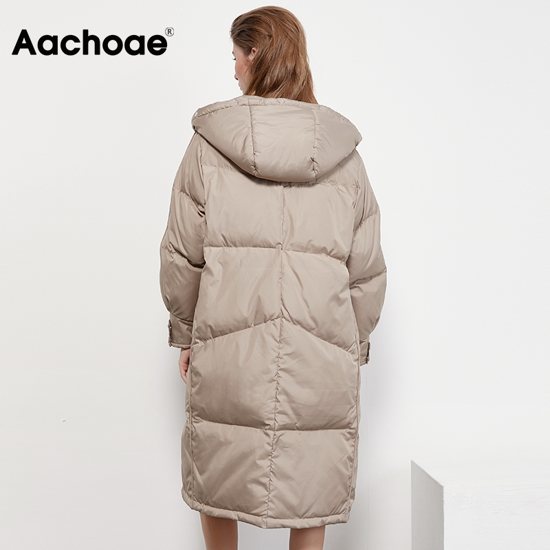 Aachoae Winter Women Coats 2020 Solid Color Fashion Long Down Jacket With Zipper Long Sleeve Button Thick Warm Hooded Coat