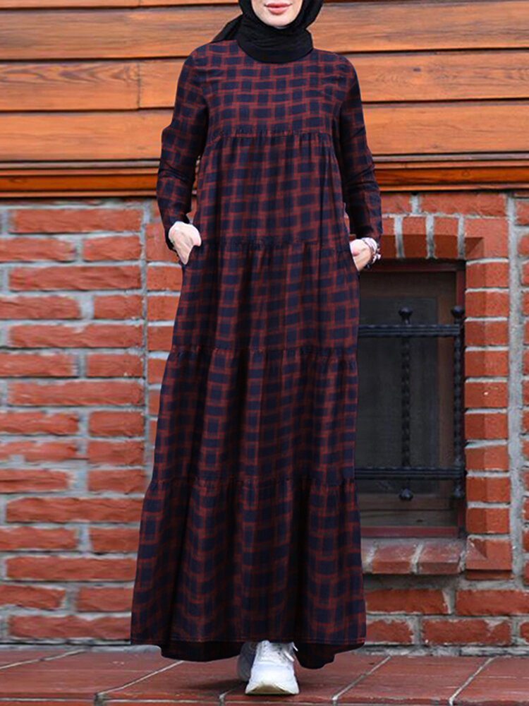 Women Ethnic Plaid Print Pocket Patchwork Casual Maxi Dress