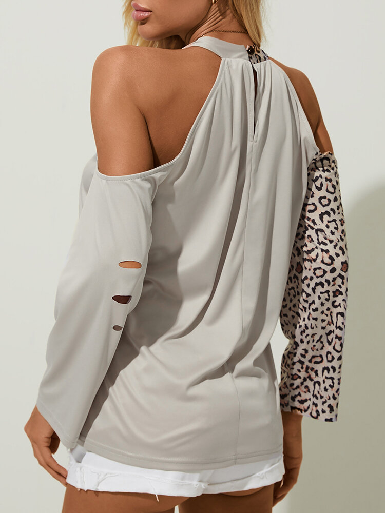 Women Leopard Print Patchwork Off Shoulder Long Sleeve Casual Blouse