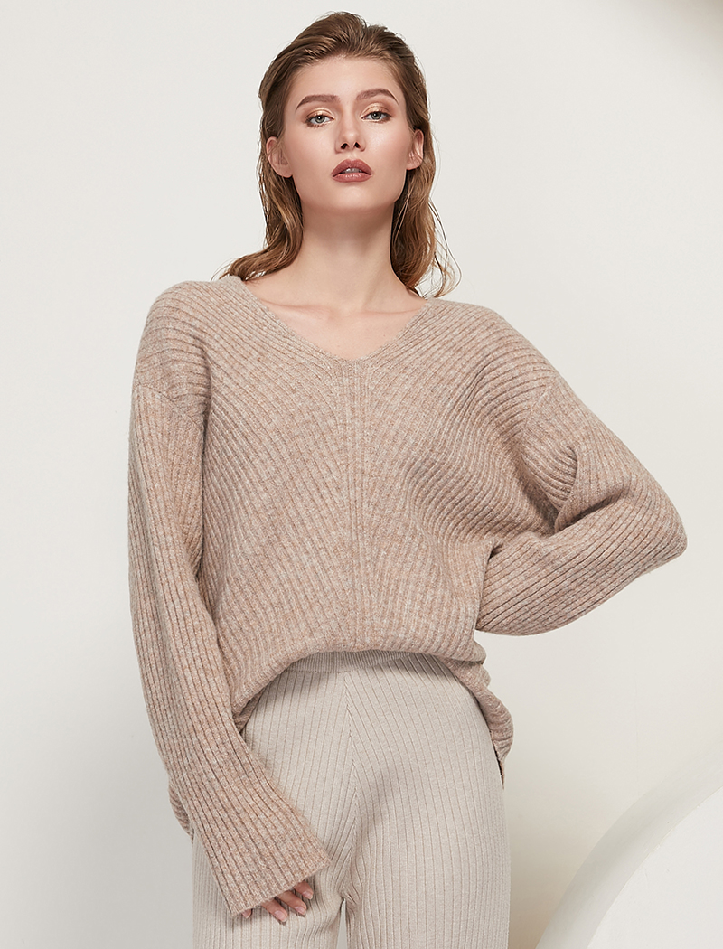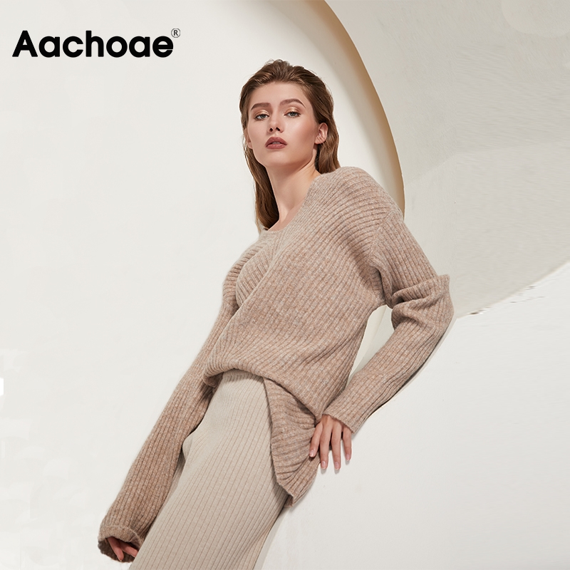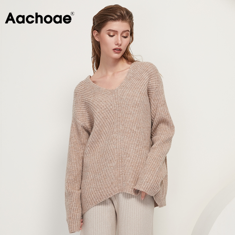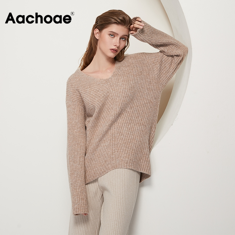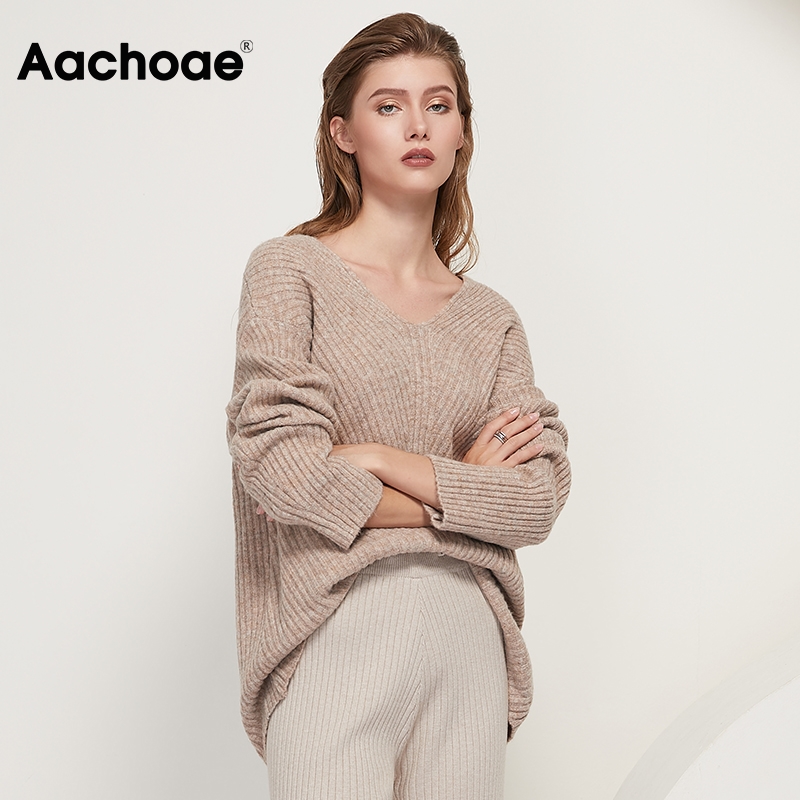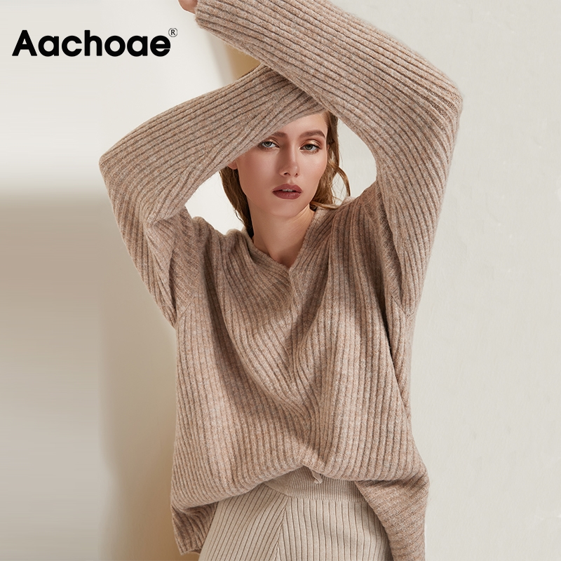 小金额 Aachoae Casual Loose Knit Sweater Women V Neck Stripe Pullover Tops Batwing Long Sleeve Solid Lady Sweaters Jumper Pulls Femme