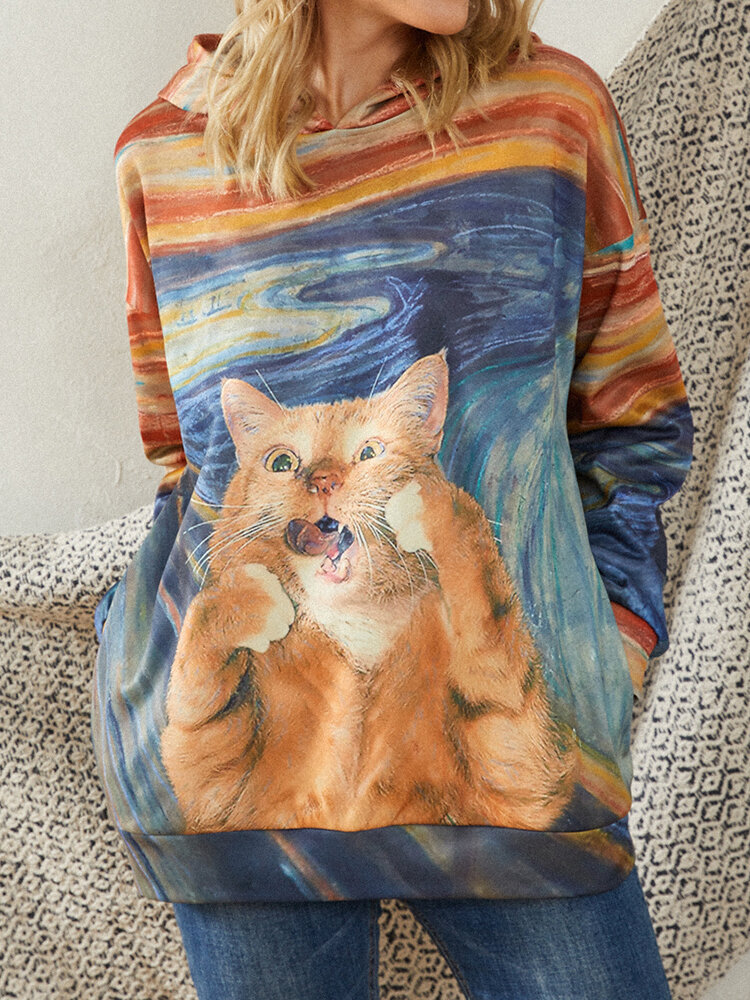 Cute Cat Print Painting Long Sleeves Casual Hoodies For Women